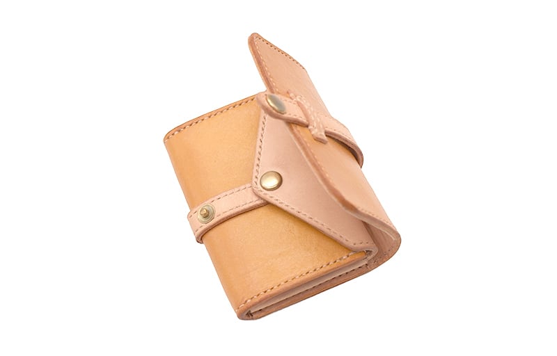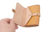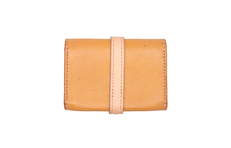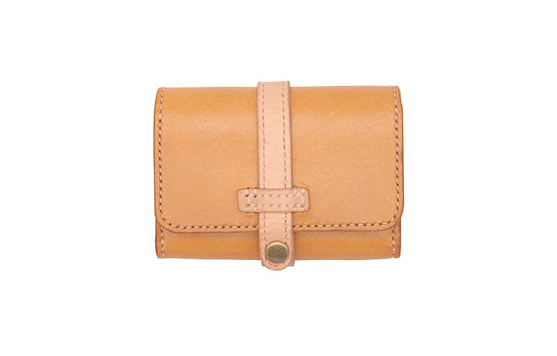手のひらに乗るサイズの小さいケースです。カードを入れる部分のほか、小銭が入るポケットがついています。お散歩のお供に、1点ものの革製品がついていきます。くるんと一周したベルトが可愛いです。